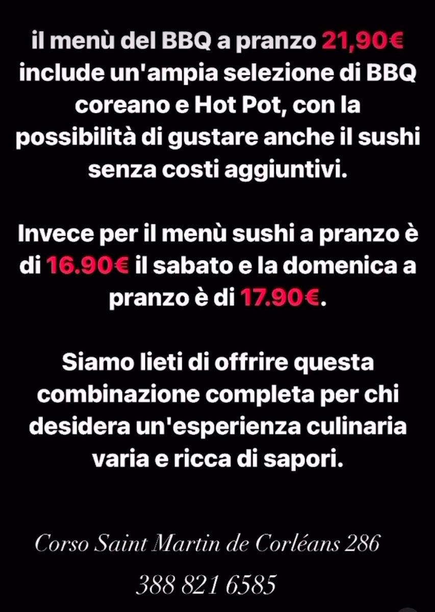 KPOT in Aosta offers a vibrant fusion of Korean, Chinese, and Japanese cuisines, with a special focus on sushi, Korean BBQ, and hotpot. Their All You Can Eat Lunch Menu at €21.90 per person features an authentic Korean BBQ experience, allowing diners to select from a variety of premium meats and fresh seafood, accompanied by traditional Korean sauces. The highlight is the interactive hotpot, where you cook your chosen ingredients in flavorful broths—each crafted to enhance the unique taste of the dishes. The fresh buffet selection empowers guests to customize their meals, ensuring a personalized culinary adventure.